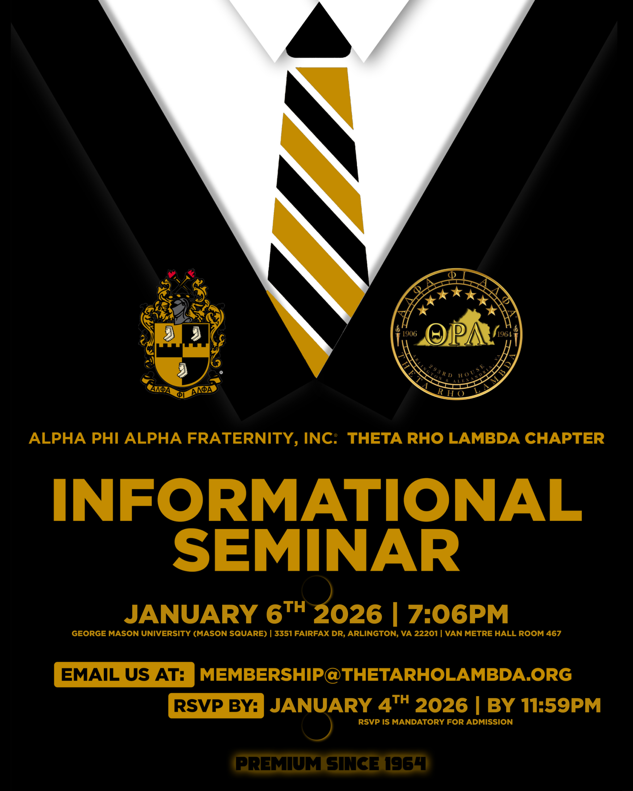 Alpha Phi Alpha Fraternity, Inc., Theta Rho Lambda Chapter, will host an Informational Seminar on Tuesday, January 6th at 7:06 p.m. at George Mason University (Mason Square), located at 3351 Fairfax Dr., Arlington, VA 22201, in Van Metre Hall, Room 467. All men who are interested in learning about membership in Alpha Phi Alpha Fraternity, Inc. should RSVP and register no later than Sunday, January 4th, 2026, by emailing membership@thetarholambda.org.